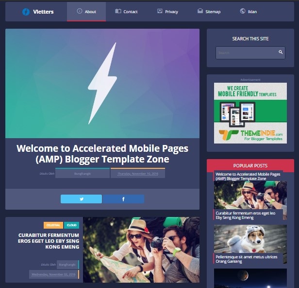 Desain yang modern kekinian, dan juga lumayan simple menjadikan AMP HTML blogger template menjadi salah satu pilihan terbaik untuk meningkatkan kecepatan dari blog yang kamu kembangkan saat ini.
