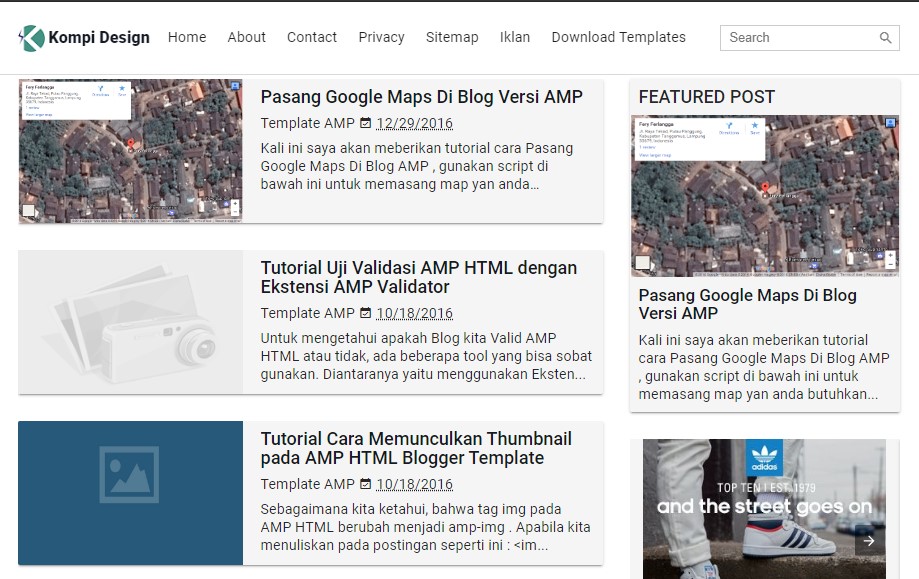 Untuk mencari referensi lain dari blogger template yang sudah valid dengan APM dan juga Seo Friendly, kamu bisa memanfaatkan contoh dari KOMPI AMP. Desain sederhana namun cocok untuk berbagai niche blog, baik itu travel, teknologi, kesehatan atau yang lainnya.