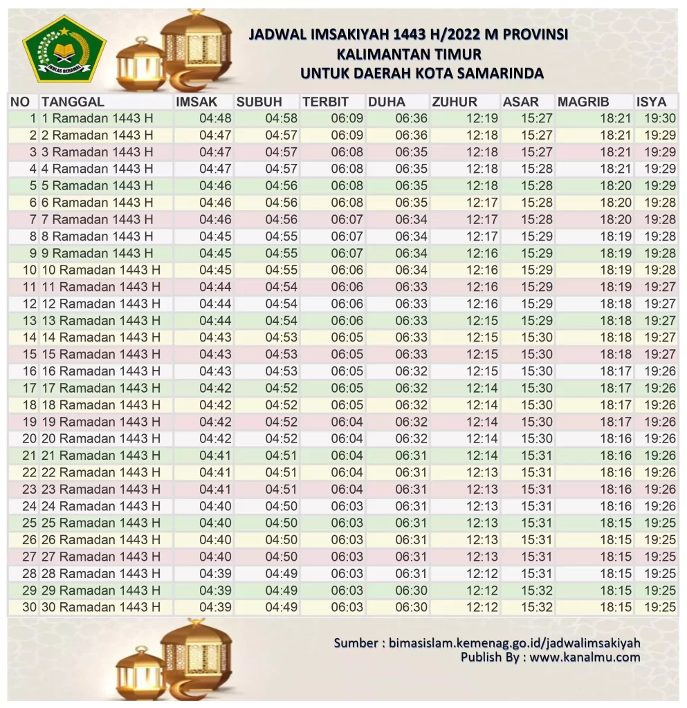 Untuk itu sobat kanalmu perlu memiliki acuan waktu untuk melaksanakan berbagai kegiatan tersebut dalam bentuk jadwal imsakiyah kota samarinda ramadhan 2022/ 1443 h