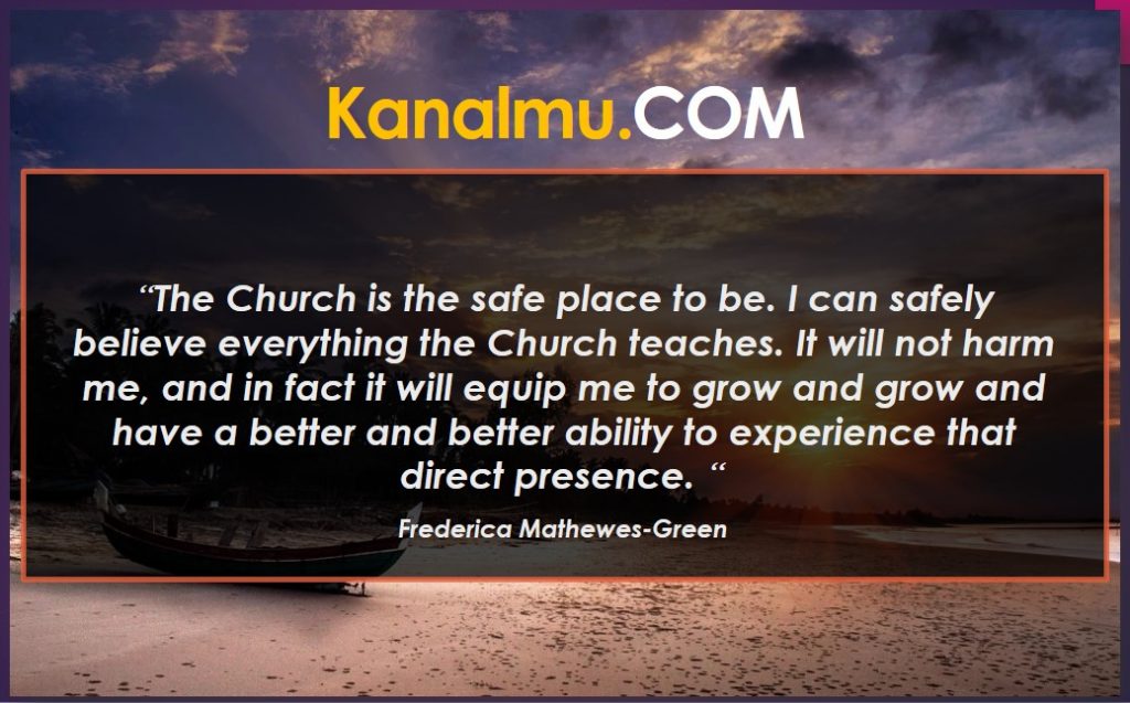 The Church is the safe place to be. I can safely believe everything the Church teaches. It will not harm me, and in fact it will equip me to grow and grow and have a better and better ability to experience that direct presence. – Author: Frederica Mathewes-Green
