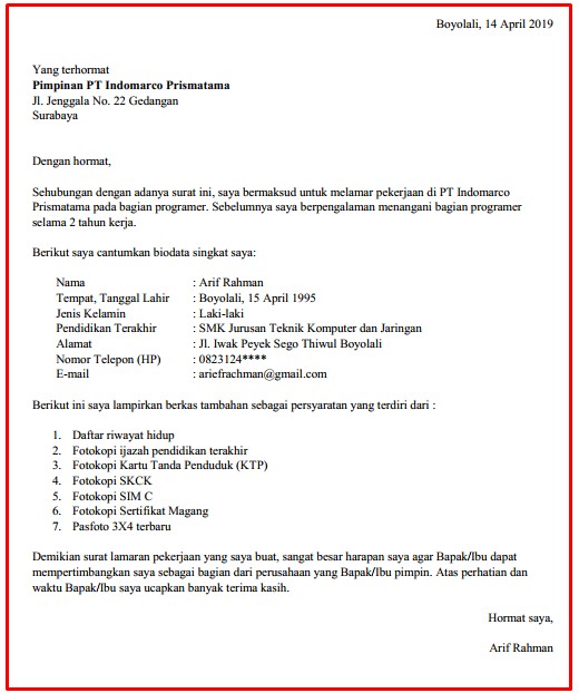 Contoh Surat Lamaran Kerja Programer di Indomaret