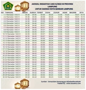 Jadwal imsakiyah berisi mengenai informasi sholat lima waktu, waktu dimulainya sahur puasa, dan jam berbuka puasa saat bulan Ramadhan.