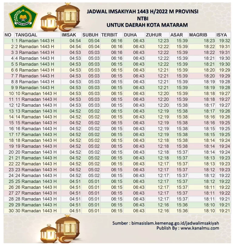 Ramadhan Jadwal Imsakiyah dan buka puasa hari ini Kota Mataram – Ramadhan 2022/1443 Hijriyah kanalmu Maret 14, 2022 Jadwal imsakiyah hari ini kota mataram di bulan ramadhan 1443 h / 2022 bisa sobat kanalmu gunakan sebagai salah satu waktu rujukan untuk menunaikan ibadah